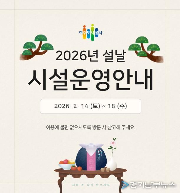 [경기남부뉴스 김혜숙 기자] 여주도시공사가 다가오는 2026년 설 연휴를 맞아 시민과 귀성객들이 안전하고 편안한 명절을 보낼 수 있도록 주요 시설 운영시간 조정 및 특별 서비스를 시행한다고 밝혔다.