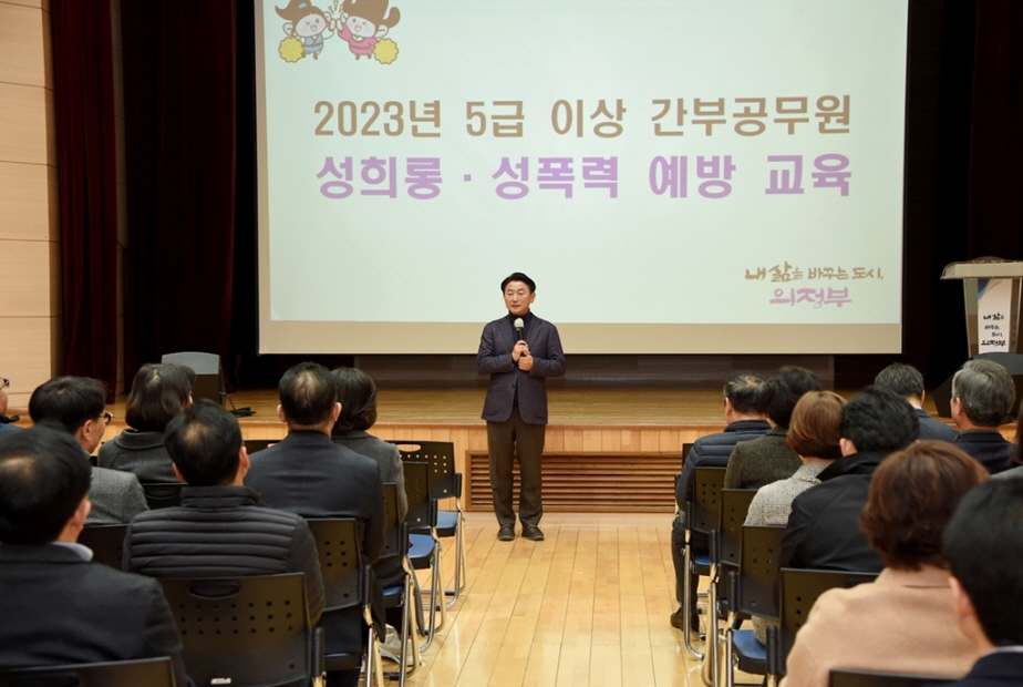 의정부시(시장 김동근)는 11월 22일 시청 대강당에서 김동근 시장을 비롯한 5급 이상 간부공무원을 대상으로 상호 배려하는 건강한 공직문화를 조성하기 위한 ‘성희롱․성폭력 예방교육’을 실시했다.