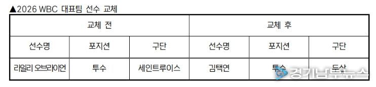 [경기남부뉴스 김혜숙 기자] KBO 전력강화위원회는 부상으로 인해 WBC 참가가 어려워진 세인트루이스 라일리 오브라이언을 대체할 선수로 두산 김택연을 확정하고 WBC 조직위에 선수 교체 승인을 요청했다.