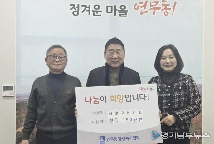 [경기남부뉴스 김정옥 기자] 수원시 장안구 연무동은 지난 19일, 상광교상인회 소속인 광교헌농원, 백운주말농장, 폭포농원, 형제농원, 자선농원 5개소가 행정복지센터를 방문해 어려운 이웃을 위한 성금 150만원을 기탁했다고 밝혔다.