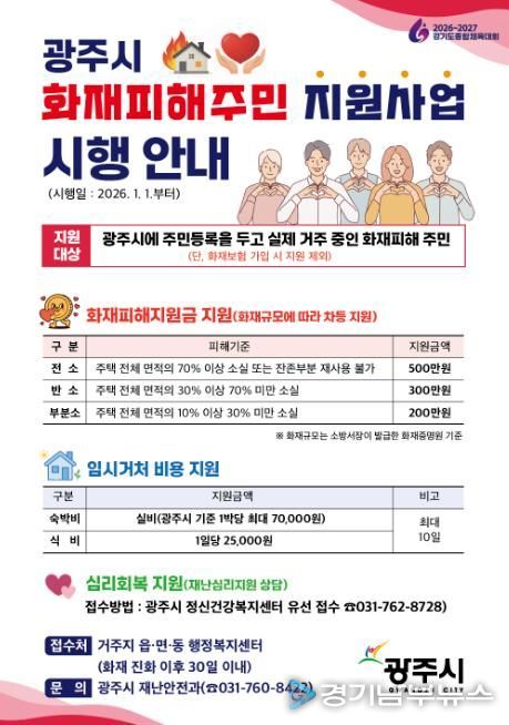 시는 ‘광주시 화재 피해 주민 지원 조례’를 2026년 1월 1일부터 시행하고 화재보험 미가입 주민을 대상으로 실질적인 생활 회복 지원에 나선다고 23일 밝혔다.