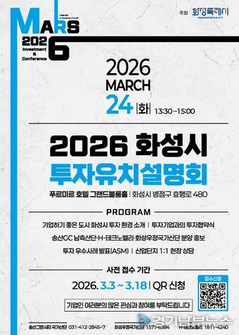 [경기남부뉴스 김정옥 기자] 화성특례시가 오는 3월 24일 푸르미르 호텔에서 ‘2026 화성특례시 투자유치 설명회’를 개최하고, 3월 3일부터 3월 18일까지 QR코드를 통한 사전접수를 진행한다.