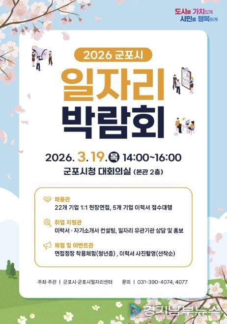 [경기남부뉴스 김혜숙 기자] 군포시는 오는 3월 19일 오후 2시부터 시청 대회의실에서 ‘2026년 군포시 일자리 박람회’를 개최한다. 이번 박람회는 지역 내 우수 기업과 구직자가 직접 만나는 채용의 장으로 제조, 서비스, 물류배송, 의료복지 등 다양한 분야에서 폭넓은 취업 기회를 제공할 예정이다.