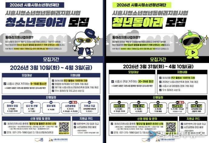 모집은 학교와 청소년 유관기관 등 시흥시 전역으로 확대해 진행된다. 모집 기간은 청소년과 청년동아리가 각각 다르게 운영되며, 청소년동아리는 3월 10일부터 4월 3일까지, 청년동아리는 3월 31일부터 4월 10일까지 신청할 수 있다.