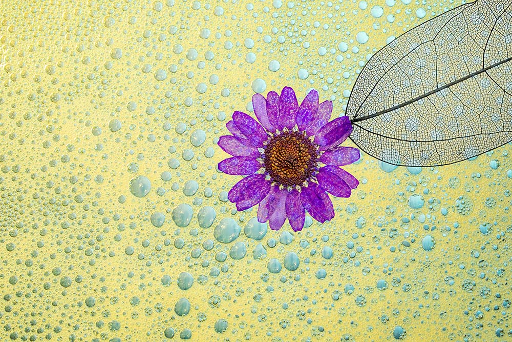 물방울들이 무수히 내려앉은 이면의 세계. 그 속에서 한 송이 꽃이 환하게 피어났다. 빛을 머금은 투명한 물방울은 이 세상이 여전히 숨을 쉬고 있다는 작은 증거처럼 반짝이고, 얇게 건조된 잎맥은 시간의 결을 따라 흐르는 삶의 흔적처럼 정제되어 있다. 그리고 그 모든 가운데, 마치 생의 한가운데서 솟구쳐 오른 희망처럼, 자줏빛 꽃이 노래하듯 펼쳐져 있다.