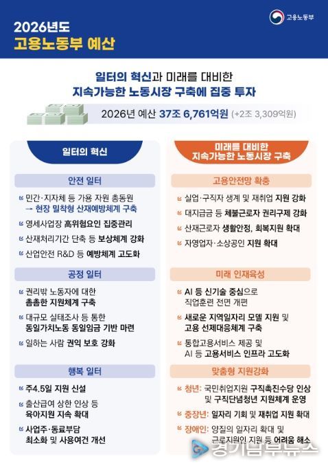 [경기남부뉴스 김혜숙 기자] 12월 2일, 국회 본회의에서 2026년도 고용노동부 소관 예산이 총지출 규모 37조 6,761억원으로 의결됐다. 올해 본예산 대비 2조 3,309억원(+6.6%) 증가했다.
