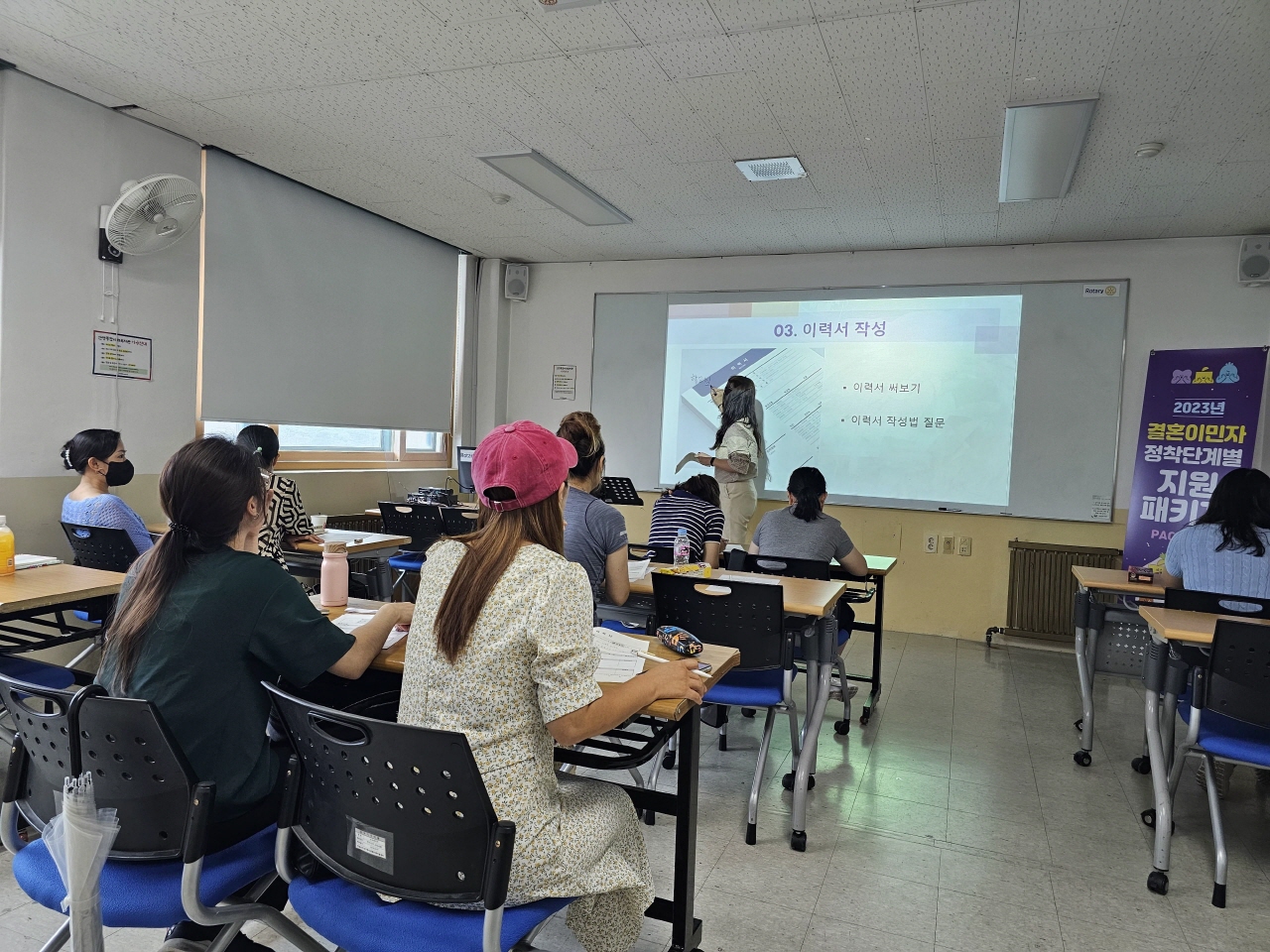 ‘결혼 이민자 취업특강’은 이력서 작성법, 면접 대비 전략, 취업 정보 파악 방법 등 다양한 주제로 구성되었으며, 취업 관련 정보와 팁을 제공하여 다문화 여성들의 취업 경쟁력을 강화하고 더 나은 취업 기회를 찾을 수 있도록 하였다.