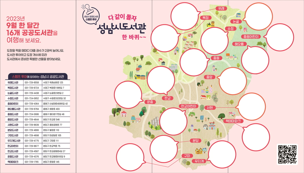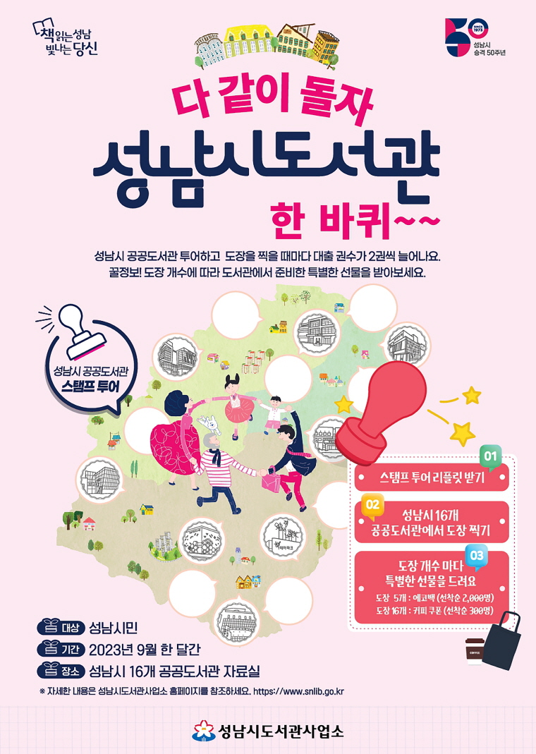 성남시는 도장 1개를 찍을 때마다 도서 대출 권수를 2권씩 확대하고, 도장 5개를 찍으면 도서관 가방을 주고, 16개를 모두 찍으면 선착순 300명에 커피 1잔 모바일 쿠폰을 지급한다.