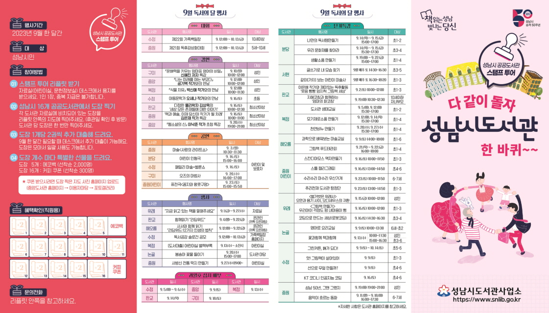 시민의 공공도서관 이용을 장려하려는 취지로 행사를 진행하며, 이 프로그램은 투어 용지에 지도로 표시된 16곳 성남시 공공도서관을 방문해 책을 빌리고서 확인 도장을 찍으면 단계별 인센티브를 제공하는 방식으로 운영한다.