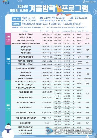 [경기남부뉴스 김혜숙 기자] 이천시는 2026년 1월부터 2월까지 겨울방학 기간에 어린이를 대상으로 한 다양한 독서문화 프로그램을 운영한다고 밝혔다.