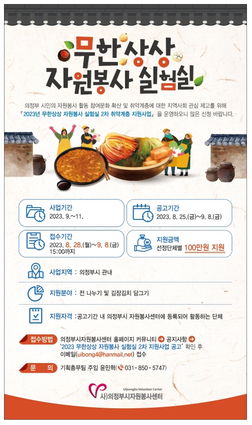 의정부시자원봉사센터(이사장 이용걸)는 지역사회의 문제와 갈등을 해소시키고 자원봉사 문화를 확산시킨 무한상상 자원봉사 실험실 1차 지원사업에 이어 의정부 관내 복지사각지대 취약계층을 대상으로 진행될 무한상상 자원봉사 실험실 2차 취약계층 지원사업 공모를 실시했다.