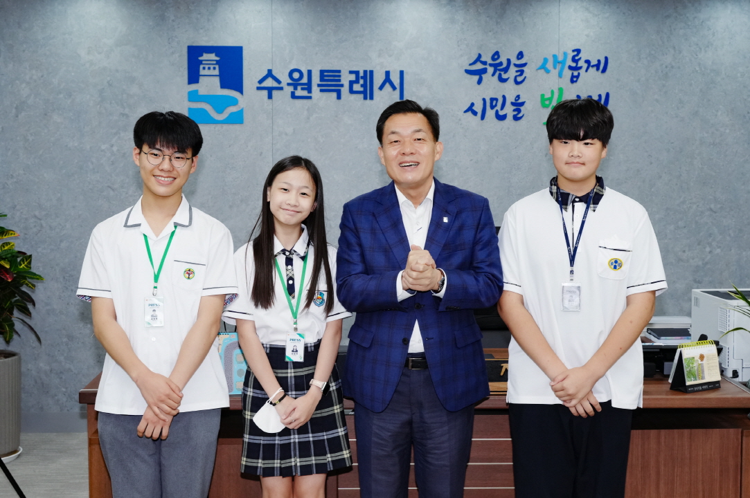 이재준 수원특례시장이 수원시청소년기자단(수원청개구리기자단)과 만나 인터뷰를 하고, 청소년들에게 ‘더 나은 수원’을 만들기 위한 계획 등을 이야기했다고 밝혔다.