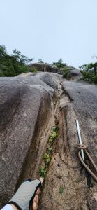 그밖에 75m대 슬랩 구간은 난이도가 별 다섯 개 너무 가파르고 한 발 한 발 내딛기가 힘들었지만, 신발 접지력이 잘 되어 밧줄은 물기로 흥건히 젖어 있었지만 잡고 오르는 데는 별문제가 없었다. 비는 계속해서 내리고 옷은 다 젓고 드디어 정상에 오르자 만감이 교차한다. 중간에 거센 빗줄기에 온몸이 젖고 힘은 들었지만, 어려웠던 것은 어디로 날아가고 정상에 도착한 기쁨과 성취감이 더 컸다. 나 자신과의 싸움에서 승리를 만끽한 다음 인증사진을 남긴 후 D 코스로 하산을 했다.