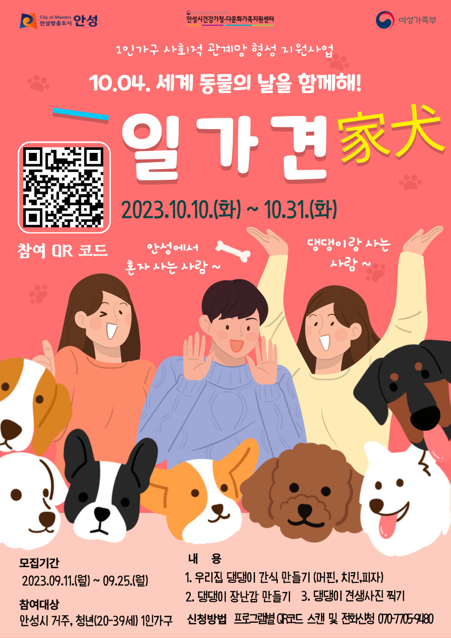 10월 4일 세계 동물의 날을 기념하여 안성시건강가정‧다문화가족지원센터는 안성시에 실거주하는 청년(만20-39세) 1인가구와 함께 사는 반려견을 대상으로 강아지 간식 만들기, 장난감 만들기, 견생 한 장 사진찍기 총 3가지의 다양한 프로그램으로 ‘세계 동물의 날을 함께해, 일가견’ 프로그램을 진행한다고 밝혔다.