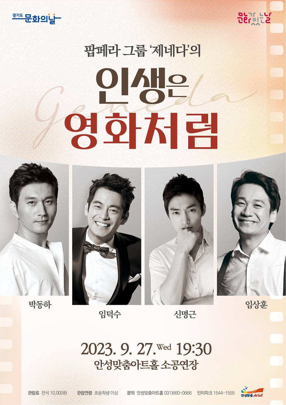 9월 문화가 있는 날 기획 공연으로 9월 27일 안성맞춤아트홀 소공연장에서 팝페라 그룹 제네다의 ‘인생은 영화처럼’ 공연을 선보인다.
