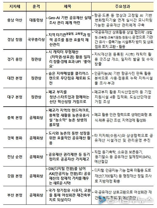 공유재산 경진대회 우수사례로 선정된 10개 지방정부는 다음과 같다.