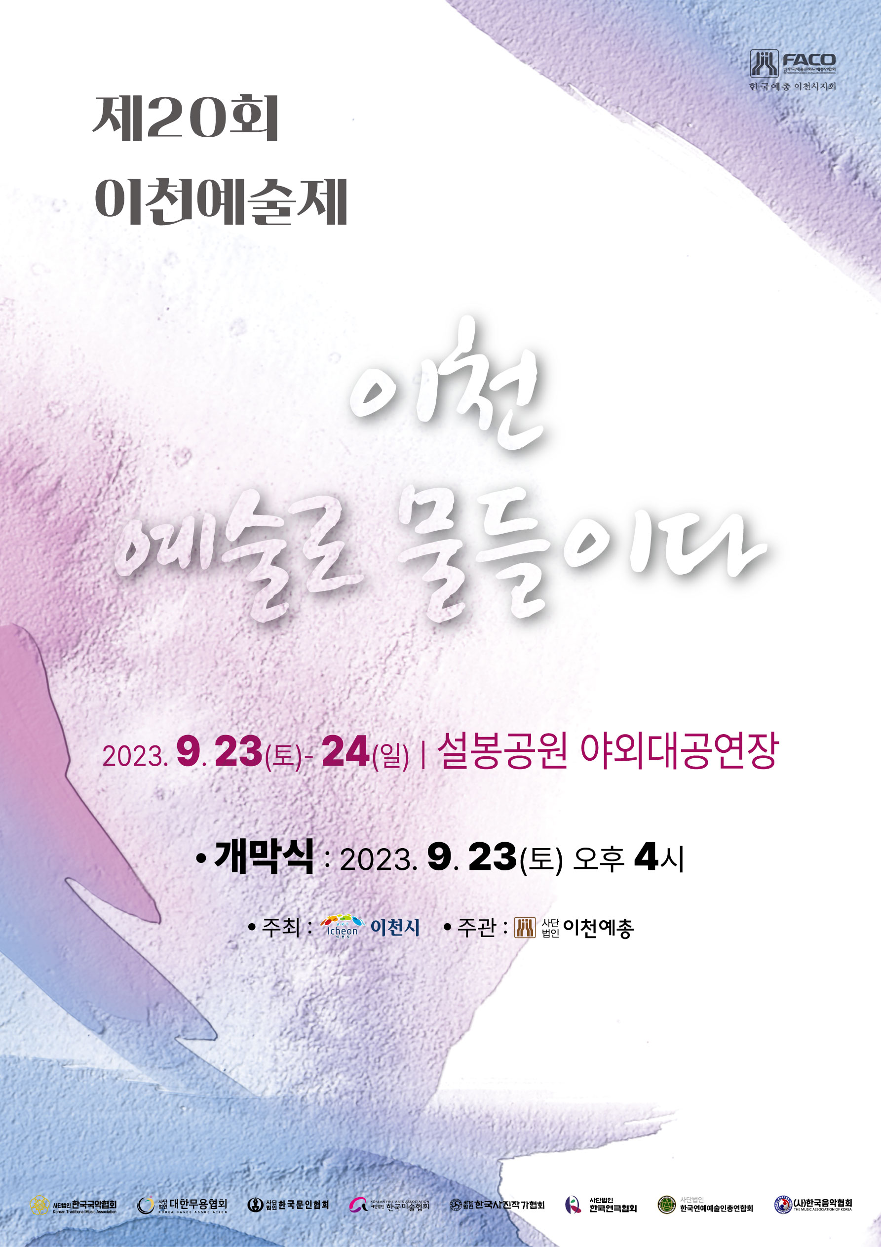 이천예술제는 (사)한국예술인총연합회 이천지부 협회들이 다함께 모여 선보이는 1년에 한 번 열리는 축제이다. 국악, 무용, 문인, 음악 등 8개 협회가 참여하며 새로운 도전과 희망을 담아 제20회 이천예술제를 풍성하게 만들고자 하였다.