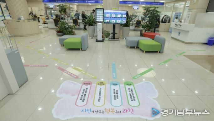 [경기남부뉴스 김혜숙 기자] 과천시는 시청을 방문하는 시민들의 민원 이용 편의를 높이기 위해 시청 1층 민원실 바닥에 ‘바닥 안내선’을 새롭게 부착했다.