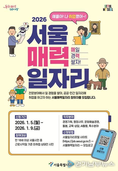 [경기남부뉴스 김혜숙 기자] 서울시는 직무교육과 실제 일 경험을 통해 민간 취업으로 연계하는 대표 디딤돌 일자리 사업인 ‘서울 매력일자리’를 2026년 총 3,600명 규모로 확대 운영한다.