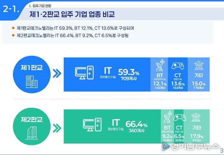 제1판교는 1,196개 기업이 입주해 전년 대비 4% 감소했으나, 제2판교는 584개 기업으로 4% 증가했다. 업종별 구성은 정보기술(IT)이 전체의 61.5%로 가장 높은 비중을 차지했고, 바이오기술(BT)과 문화기술(CT)이 각각 11%로 뒤를 이었다. 기업 규모별로는 중소기업이 85%로 높은 비중을 나타냈으며, 중견기업은 9.3%, 대기업은 3.7%로 나타나 중소기업 중심의 혁신 생태계가 유지되고 있음을 확인했다.