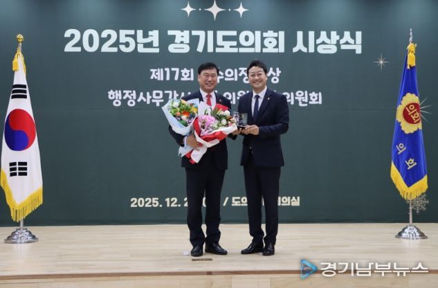 [경기남부뉴스 김혜숙 기자] 경기도의회 교육기획위원회 이택수 의원(국민의힘, 고양8)과 성기황 의원(더불어민주당, 군포2)이 26일 열린 2025년 경기도의회 시상식에서 ‘2025년 행정사무감사 우수위원’으로 선정됐다.
