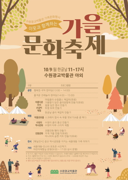 세종대왕과 인연이 깊은 수원광교박물관이 한글날인 9일 오전 11시부터 오후 5시까지 박물관 야외에서 ‘이웃과 함께하는 가을문화축제’를 연다.