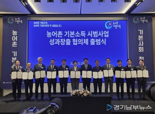 행사에서는 기본사회 강연을 시작으로 농어촌기본소득 시범사업 추진계획과 지역별 특화모델 운영 방향, 연구단 구성·운영 및 정책평가 계획이 공유됐다. 이어 농식품부–경인사연–10개 군이 참여하는 업무협약 체결과 협의체 출범 퍼포먼스, 기념촬영이 진행됐다.