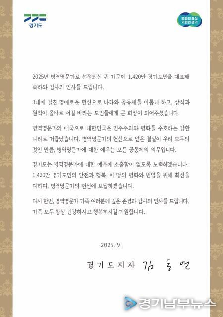 김동연 경기도지사는 서한문을 통해 “병역명문가의 애국으로 대한민국은 민주주의와 평화를 수호하는 강한 나라로 거듭났다”면서 “경기도는 병역명문가에 대한 예우에 소홀함이 없도록 노력하겠으며, 헌신에 보답하겠다”고 감사와 존경의 뜻을 표현했다.