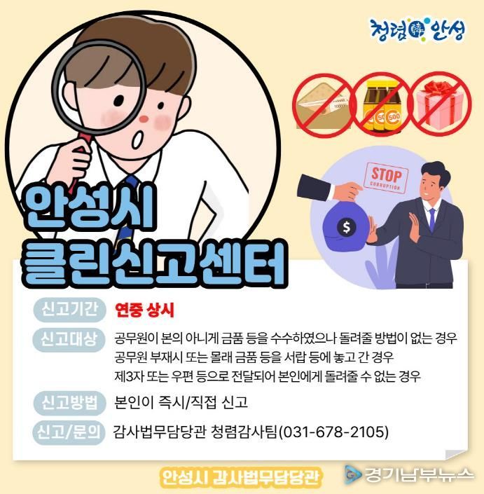 [경기남부뉴스 김혜숙 기자] 안성시는 시민들에게 신뢰받는 공정하고 투명한 행정 서비스를 제공하기 위해 ‘클린신고센터’를 연중 상시운영하며 청렴한 행정문화 정착에 힘쓰고 있다고 밝혔다.