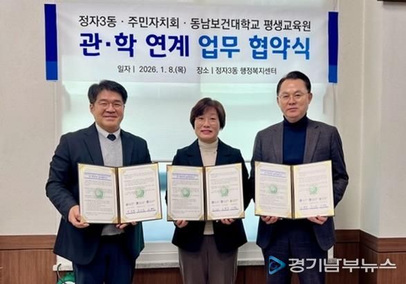 [경기남부뉴스 김정옥 기자] 수원시 장안구 정자3동 행정복지센터와 주민자치회는 지역 내 협력 기반을 구축해 주민 맞춤형 프로그램을 확대하고자 지난 8일 동남보건대학교 평생교육원과 업무협약을 체결했다.