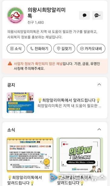 [경기남부뉴스 김혜숙 기자] 의왕시가 위기가구 및 복지사각지대 발굴하기 위한 ‘희망알리미톡’채널을 연중 운영하고 있다고 밝혔다.