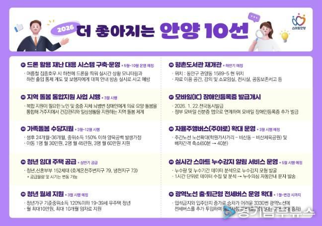 안양시(시장 최대호)는 ▲드론 활용 재난 대응시스템 구축·운영 ▲지역 돌봄 통합지원사업 시행 ▲가족돌봄수당 지원 ▲청년임대주택 공급 ▲안양시 청년월세 지원(사업대상 확대) ▲평촌도서관 재개관 등 ‘2026년 더 좋아지는 안양 10선’을 12일 소개했다.