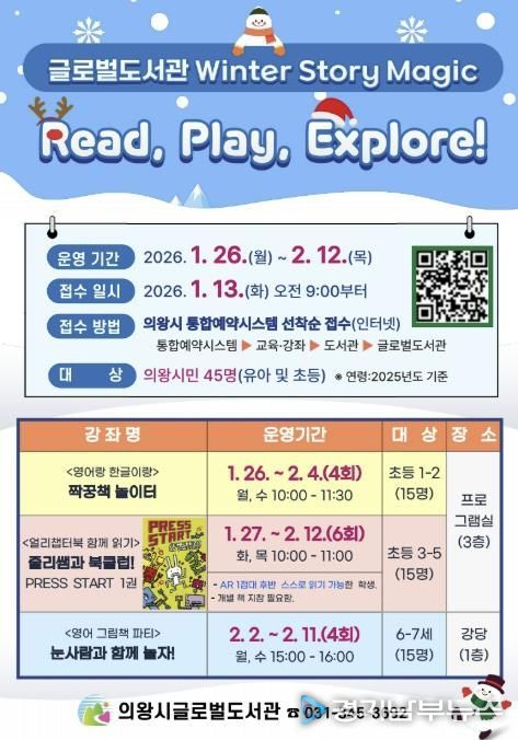 [경기남부뉴스 김혜숙 기자] 의왕시 글로벌도서관(보식골로 30-10)이 영어책과 함께하는 즐거운 겨울방학을 보낼 수 있도록 유아, 초등학생 대상 특별 프로그램 'Winter Story Magic: Read, Play, Explore!'를 1월 26일부터 2월 12일까지 진행한다.