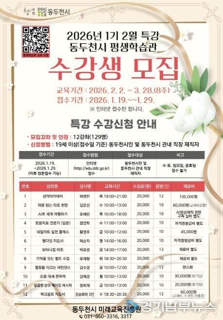 [경기남부뉴스 김혜숙 기자] 동두천시는 시민의 자기계발과 평생학습 참여 기회를 확대하기 위해 2026년 평생학습관 2월 특강 수강생을 모집한다고 밝혔다.