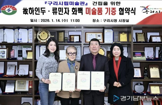 [경기남부뉴스 김혜숙 기자] 구리시는 지난 14일 시청 3층 시장실에서 ‘구리시립미술관 건립을 위한 작품 기증 협약식’을 개최했다. 이번 협약식은 한국 현대미술사의 거장 고(故) 하인두 화백의 작품 80점과 류민자 화백의 작품 25점을 기증받고, 문화예술 교류 협력을 공식화하기 위해 마련됐다.