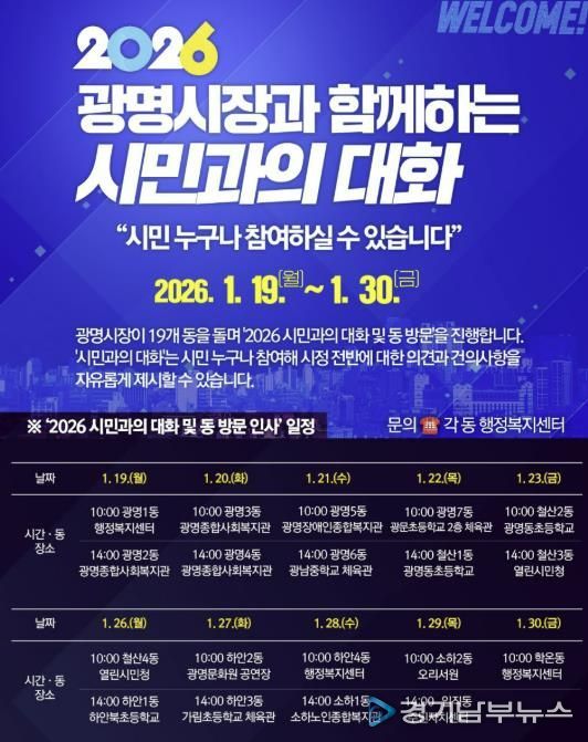 광명시는 오는 19일부터 30일까지 관내 19개 동에서 순차적으로 ‘시민과의 대화’를 진행한다고 15일 밝혔다.
