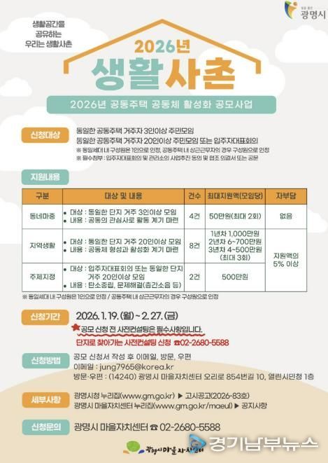 시는 공동주택 이웃 간 관계 회복과 생활권 중심 공동체 문화 확산을 위해 ‘2026년 광명시 생활사촌 공동주택 공동체 활성화 공모사업’ 참여자를 오는 2월 27일까지 모집한다.