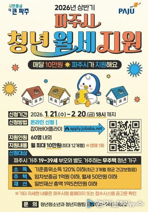 [경기남부뉴스 김혜숙 기자] 파주시는 주거비 부담으로 어려움을 겪고 있는 19~39세 청년 가구를 대상으로 월 최대 10만 원씩 최대 12개월간, 총 120만 원의 월세를 지원한다.