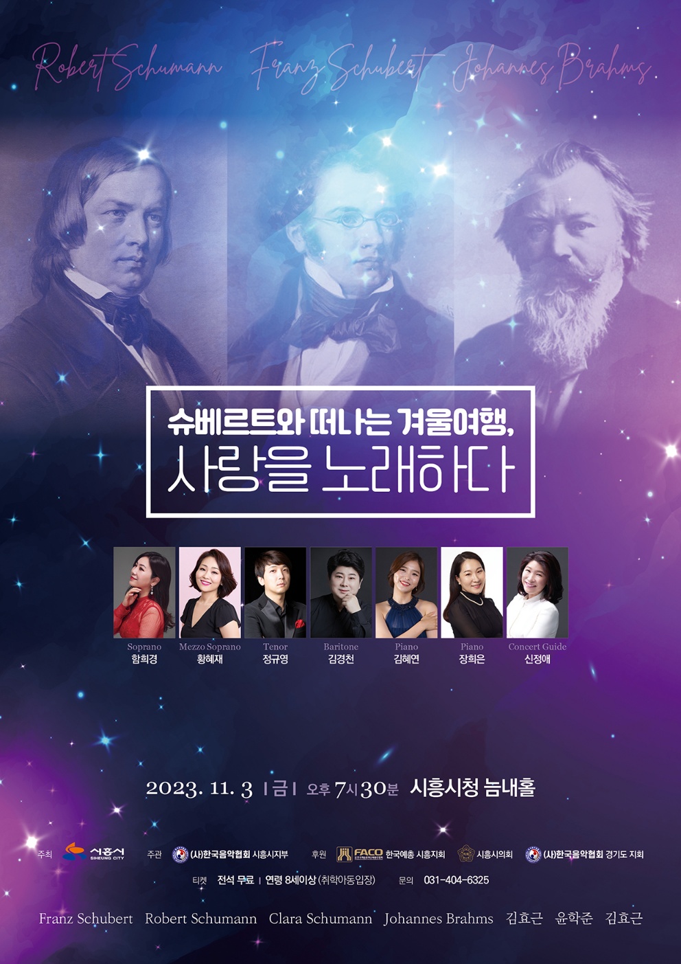 공연은 총 3부로 진행된다. 1부와 2부에서는 슈베르트, 슈만, 브람스의 명곡들이 한데 모였다. 3부에서는 국내 작곡가 김효준, 윤학준의 가곡들까지 소프라노 함희경, 메조 소프라노 황혜재, 테너 정규영, 바리톤 김경천의 아름다운 목소리로 감상할 수 있다.