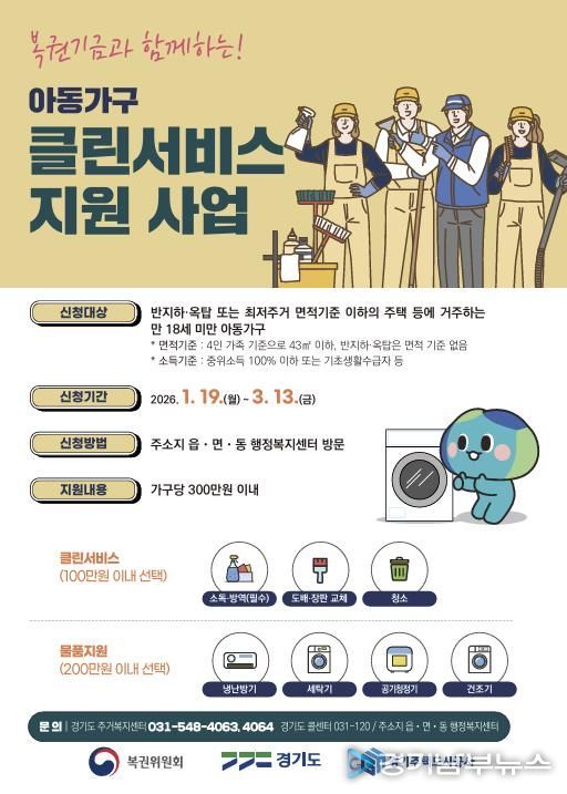 [경기남부뉴스 김혜숙 기자] 안성시는 복권기금과 함께하는 경기도 ‘아동가구 클린서비스 지원사업’ 신청을 1월 26일부터 3월 13일까지 받는다.