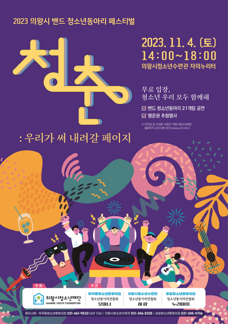 이번 페스티벌은 의왕시청소년재단(이사장 김성제)이 주최하고 의왕시청소년수련관, 부곡동청소년문화의집, 포일청소년문화의집 3개 기관의 청소년동아리연합회 ‘하람’, ‘모아나’, ‘누리아띠’가 주관한다.