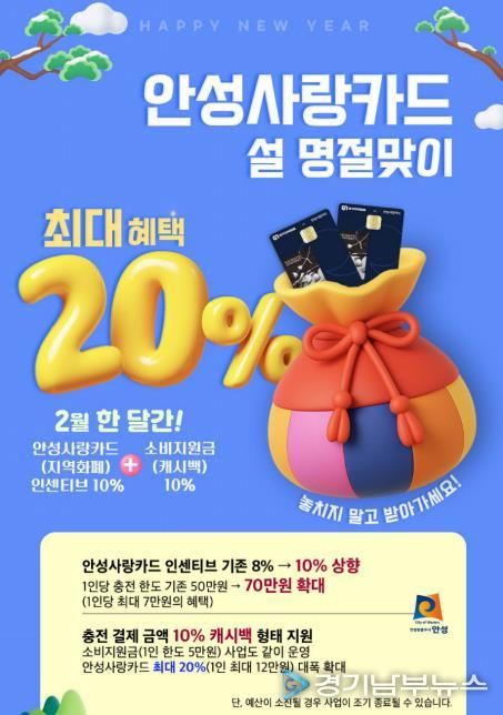 [경기남부뉴스 김혜숙 기자] 안성시가 설 명절을 맞아 시민들의 장바구니 부담을 덜어주고, 위축된 골목상권에 활력을 불어넣기 위해 2월 한 달간 안성사랑카드 혜택을 최대 20%로 상향한다.