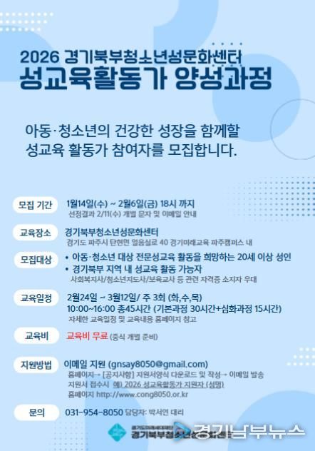 [경기남부뉴스 김혜숙 기자] 경기북부청소년성문화센터가 오는 2월 6일까지 청소년 성교육 활동가 양성과정에 참여할 지원자를 모집한다.