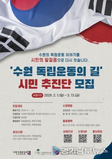 시민사회단체로 구성한 ‘수원 독립운동의 길 추진위원회’와 수원시자원봉사센터는 다음 달 13일까지 시민추진단을 공개 모집하기로 했다고 2일 밝혔다.