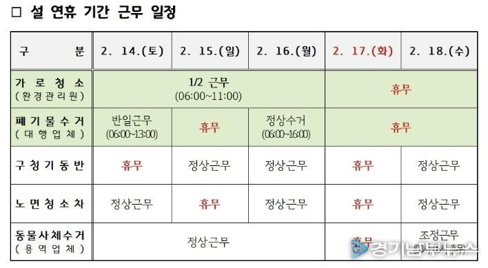 이와 함께 연휴 기간 중 생활폐기물 수거 일정을 공동주택 게시판, 안내방송, 홈페이지 등을 통해 알리고, 음식물 쓰레기 감량과 올바른 분리배출방법도 적극 홍보 예정이다.
