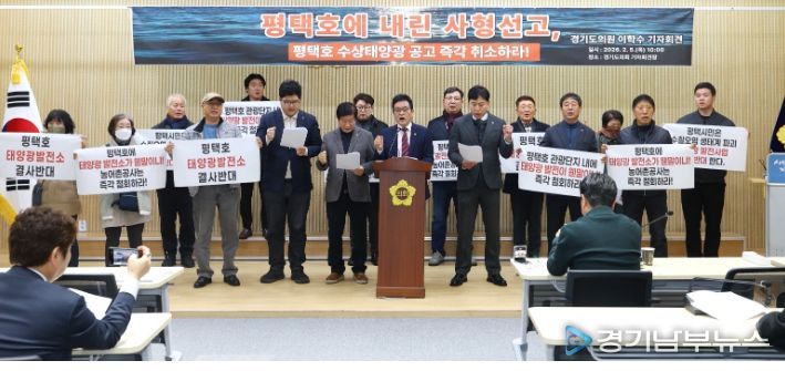 [경기남부뉴스 김혜숙 기자] 경기도의회 이학수 의원(국민의힘, 평택5)은 5일(목) 경기도의회 기자회견장에서 기자회견을 열고 한국농어촌공사가 발표한 평택호 수상태양광 사업 공고의 즉각적인 취소를 강력히 요구했다.