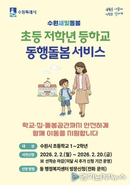 [경기남부뉴스 김정옥 기자] 수원특례시가 ‘초등 저학년 등하교 동행돌봄서비스’ 사전 신청 기간을 운영한다.