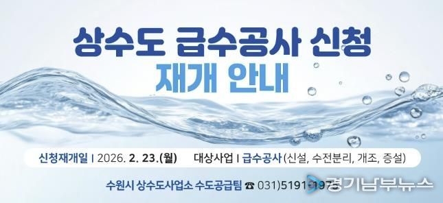 [경기남부뉴스 김정옥 기자] 수원시상수도사업소가 겨울철 기온 강하로 인한 부실 공사 등을 예방하기 위해 중단했던 상수도 급수공사 신청을 2월 23일부터 재개한다.