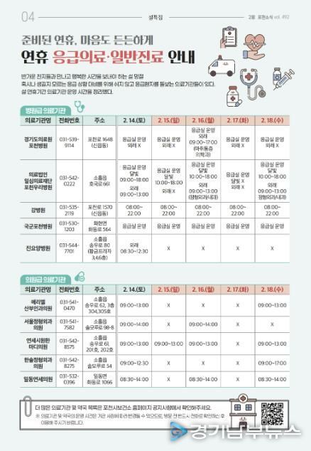 [경기남부뉴스 김혜숙 기자] 포천시는 오는 14일부터 18일까지 설 연휴 기간 동안 시민들이 안정적으로 의료서비스를 이용할 수 있도록 응급대응체계를 강화한다.