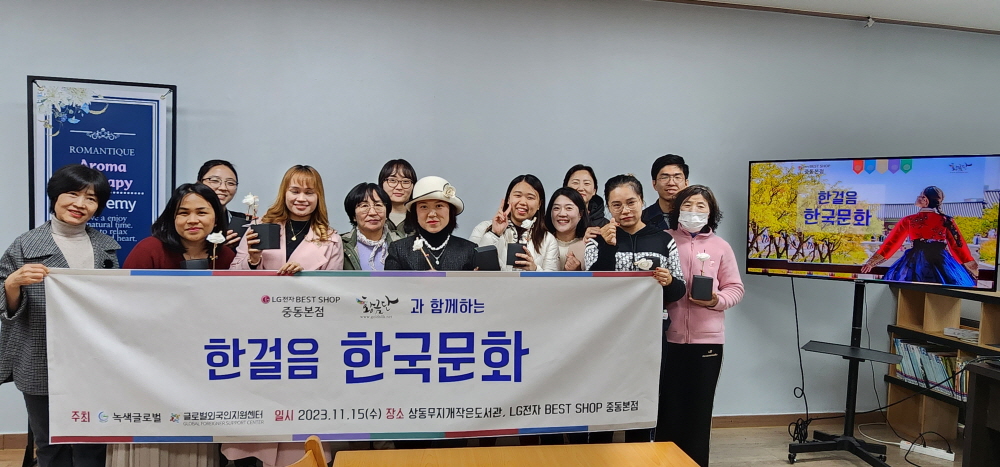 글로벌외국인지원센터는 11월 15일 다문화가족을 대상으로 <한걸음 한국문화> 문화행사를 진행했다. 다문화가족이 한국의 전통문화를 느끼고 체험해볼 수 있는 자리를 마련한 이번 행사는, 전래동화를 통한 한국문화 강연, 아로마 디퓨저 만들기, 한복체험 등의 프로그램으로 이루어졌다. 참석자들은 적극적으로 프로그램에 임하며 특히 한복을 입어본 후 고국의 문화와 색다른 문화에 신기해하며 체험에 만족했다.